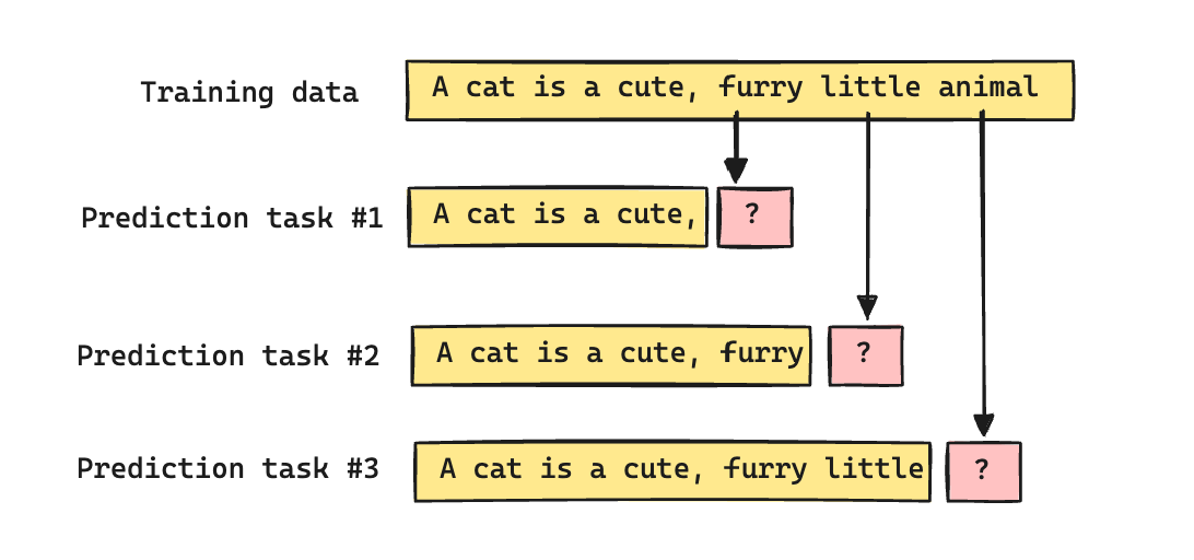 First, it requires no labels. The text itself is labeled data. If the sentence “A cat is a cute, furry, little animal” was found in the training data, “cute” is the label for “A cat is a”, “furry” is the label for “A cat is a cute, ”, and so on. Unlike sentiment or other kinds of prediction tasks, every sentence in the training data comes with labels for free. This is what allowed the models to train on the scale of the internet.